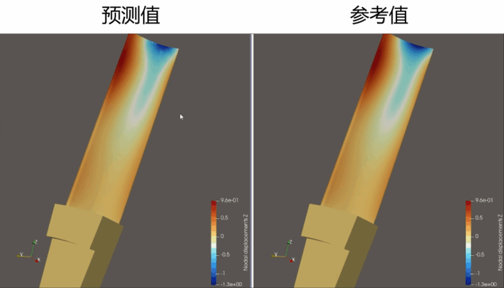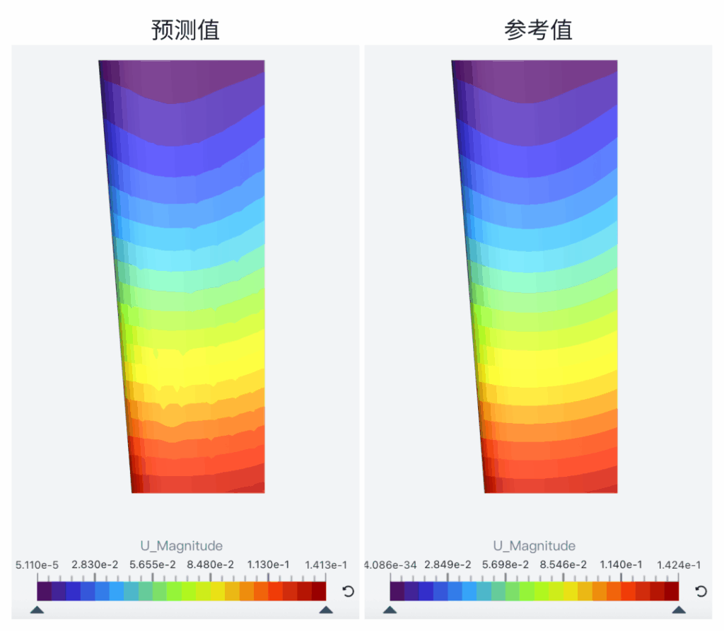 云境智仿基于智能求解算法,通过对不同后掠角、展长、梢跟比参数构建的30组机翼仿真数据进行训练,得到了机翼变形及应力预测模型,前10阶模态的预测值与参考值的平均相对误差小于3.3%,使得机翼参数的设计迭代效率显著提升。